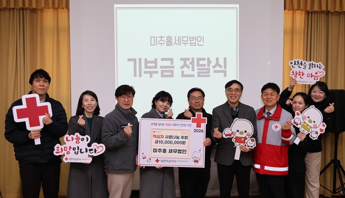 [매일안전신문=김진섭 기자] 미추홀 세무법인이 연말연시를 맞아 대한적십자사 인천지사에 적십자 기부금 1,000만원을 전달하며 따뜻한 나눔의 손길을 전했다.