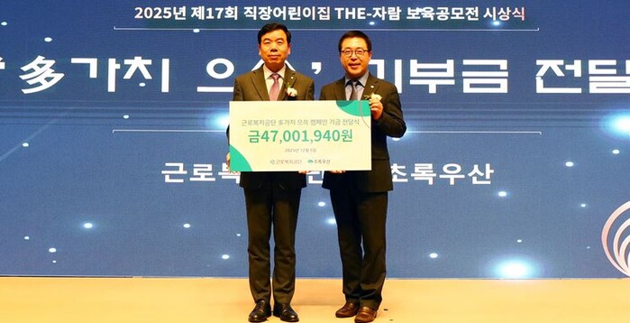 [매일안전신문=김진섭 기자] 근로복지공단이 전국 직장어린이집과 함께 추진한 ‘다(多)가치 으쓱(ESG)’ 나눔 행사를 통해 모인 수익금 4천7백만 원을 초록우산에 기부했다.