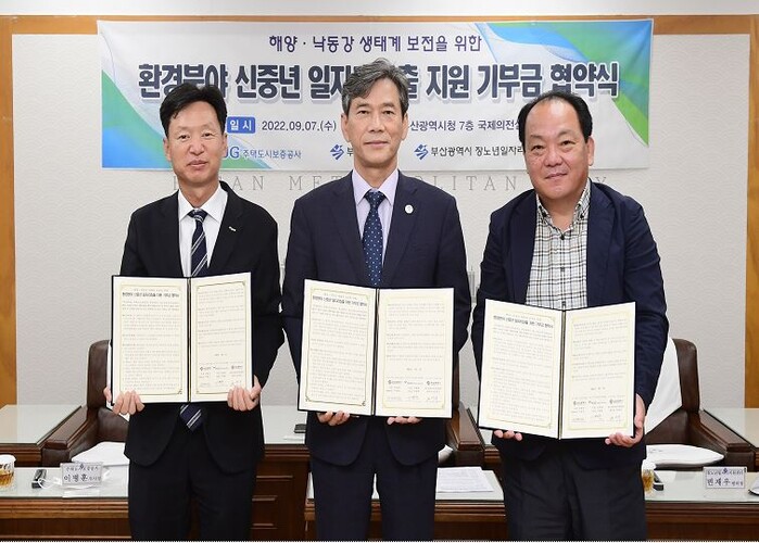 | ▲ 이병훈 HUG 부사장(왼쪽), 이병진 부산시 행정부시장(가운데)와 변재우 부산시 장 노년 일자리지원 센터장(오른쪽)(사진,주택도시보증공사 제공) |