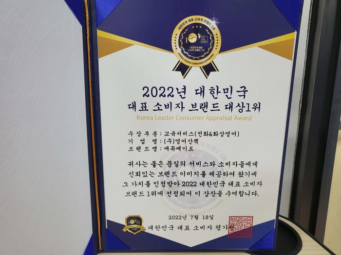 에듀메이트가 ‘2022 대한민국 대표 소비자 브랜드 대상’ 전화&화상영어 부문에서 1위를 수상하는 영예를 안았다.