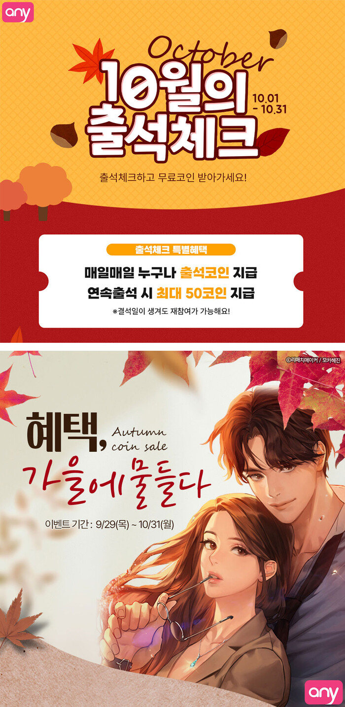 출석 프로모션의 경우, 애니툰에 출석 도장을 찍고 무료 코인을 지급받는 프로모션이다. 매일매일 누구에게나 출석 코인이 지급되며 연속 출석 시 최대 50코인까지 지급받을 수 있다. 오는 10월 1일부터 진행된다.