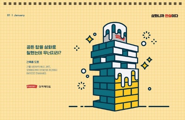 ‘안심속담 캘린더’는 1월부터 12월까지 우리나라의 고유 속담을 삼화페인트 대표 제품들과 연계시켜 재해석한 달력이다.