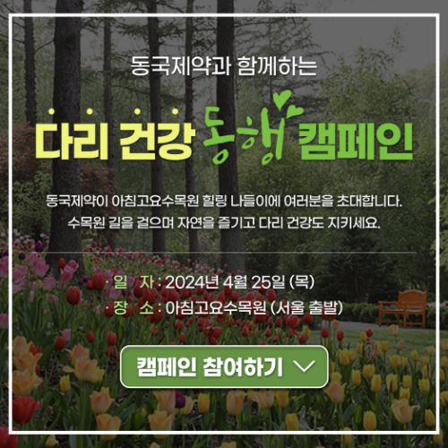 동국제약이 야외 나들이 시즌을 맞아 오는 4월 25일 아침고요수목원에서 진행되는 ‘동국제약과 함께하는 다리건강 동행캠페인’ 참가자를 모집한다고 2일 밝혔다.
