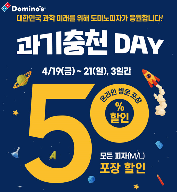 도미노피자 관계자는 “오늘부터 3일간 모든 회원분들이 과학의 날의 의미를 되세기고 즐겁게 보내시길 바라는 마음을 담아 50% 할인 프로모션을 기획했다”라며 “과학의 날도 기억하고 과기충천 Day의 혜택을 놓치지 마시기 바란다”라고 말했다.