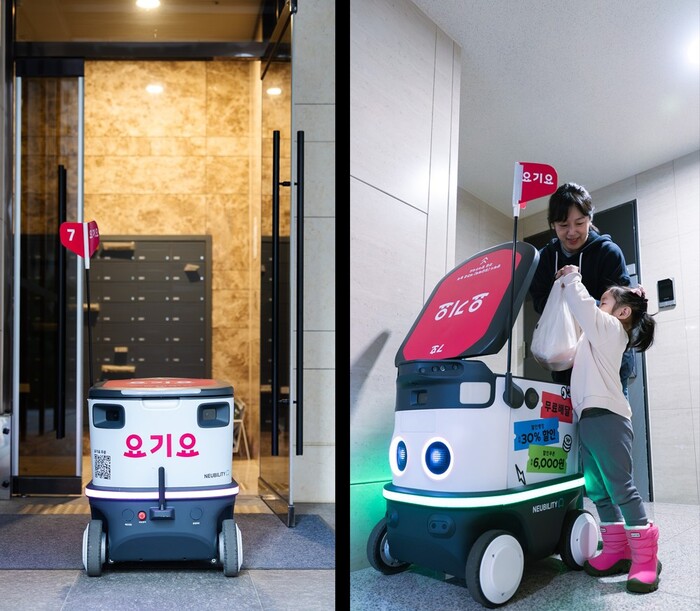 요기요는 자율주행 로봇 서비스 기업 뉴빌리티와 서울 서초구 래미안 리더스원 아파트 단지에서 로봇이 각 세대 현관 앞까지 음식을 직접 전달하는 로봇배달 서비스를 시작했다.