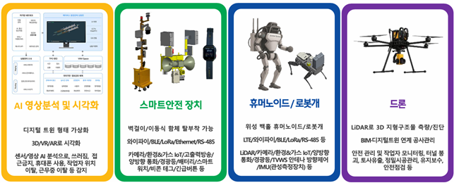 특히, 재난으로 인터넷이 끊어지더라도 긴급하게 저궤도위성 백홀 지하터널 공사장에 휴머노이드 및 로봇개를 투입하기 위해서는 필수적으로 터널내에서 원거리 TVWS 기술이 필수적으로 요구되고 있다. 다양한 AI 기술과 결합되면서, 중대산업재해 사전 예방, 긴급대응, 재발방지를 위한 정확한 원인파악이 가능한 스마트안전 플랫폼으로 발전하고 있다.