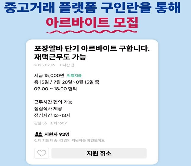 [매일안전신문=김진섭 기자] 최근 중고거래 플랫폼에서 구인 광고 등을 통해 개인정보를 탈취, 사기 거래를 시도하는 사례가 발생하고 있어 이용자들의 각별한 주의가 요구된다.