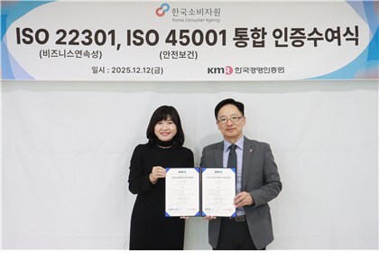 [매일안전신문=김진섭 기자] 한국소비자원이 안전보건 경영시스템(ISO 5001)·비즈니스 연속성 경영시스템(ISO 22301) 인증을 동시에 받았다.