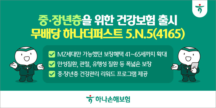 중·장년층은 건강 이상 신호를 체감하는 시점과 치료·검사 빈도가 증가하는 시기로, 실제로 질환 위험과 생활 리스크가 함께 높아지는 연령대다. 그럼에도 기존 보험시장에서는 연령 제한, 심사 부담, 보장 축소 이유 등으로 중장년 고객이 실질적으로 선택할 수 있는 건강보험의 폭이 제한적이었다. 하나손해보험은 이러한 보장 격차를 해소하고자, 중장년 고객도 젊은 연령대와 거의 동일한 수준의 상해·암·뇌·심장 질환 등에 대해 폭넓은 보장을 제공하는 ‘5.N.5(4165)’를 선보였다.