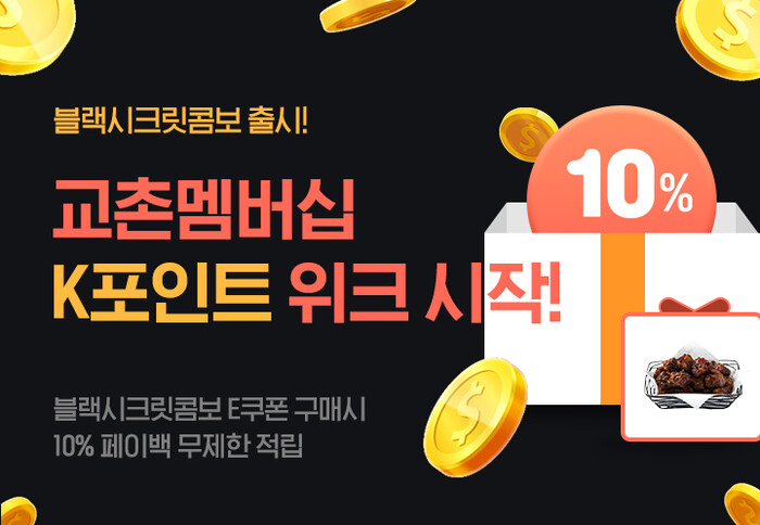 이번 이벤트는 교촌치킨앱에서 다음달 31일까지 진행된다. ‘블랙시크릿콤보’ E쿠폰을 구매하는 교촌치킨앱 회원 대상으로 총 구매금액의 10%를 K포인트로 적립하는 혜택을 제공한다.