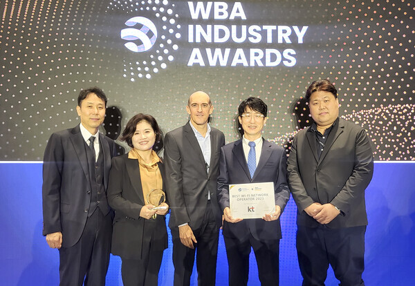 WBA 어워드는 전 세계 와이파이 분야에서 가장 뛰어난 성과와 혁신을 이뤄낸 기업을 선정하는 최고 권위의 글로벌 시상식이다. KT는 지난해에 이어 3년 연속으로 ‘최고 와이파이 네트워크 사업자’ 부문을 수상했다.