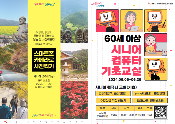서울시 관악복합평생교육센터(이하 센터)는 평생학습의 열린배움터로서 서울시민의 공공복리 증진을 위한 다양한 평생교육 프로그램을 운영하고 있으며, 6월에 60세 이상 시니어 대상 무료 강좌를 개강한다고 밝혔다.