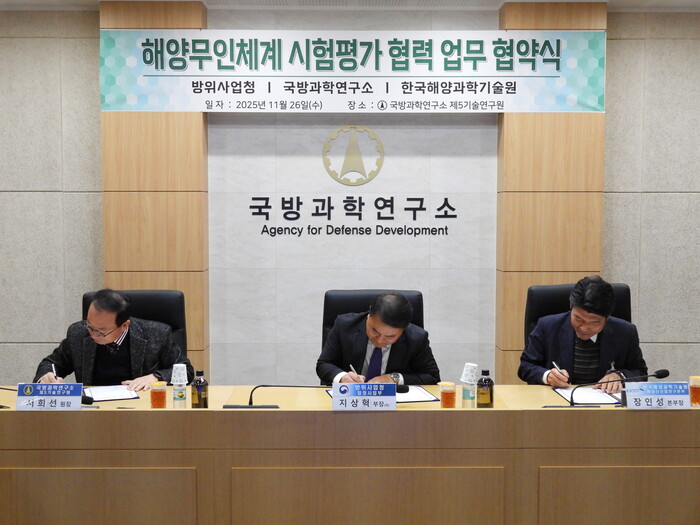 [매일안전신문=김진섭 기자] 방위사업청이 국방과학연구소, 한국해양과학기술원과 해양 무인체계 시험평가 분야 발전을 위해 손을 맞잡았다.