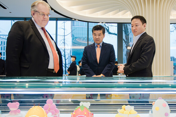 | ▲ 19일 '워크샵 바이 배스킨라빈스' 매장 오픈 기념 행사에서 허희수 비알코리아 전략총괄임원(오른쪽)이 제프리존스 주한미국상공회의소 이사장(왼쪽)과 제임스 김 주한미국상공회의소 회장(중앙)에게 매장과 제품에 대해 설명하고 있다.(사진: SPC제공) |