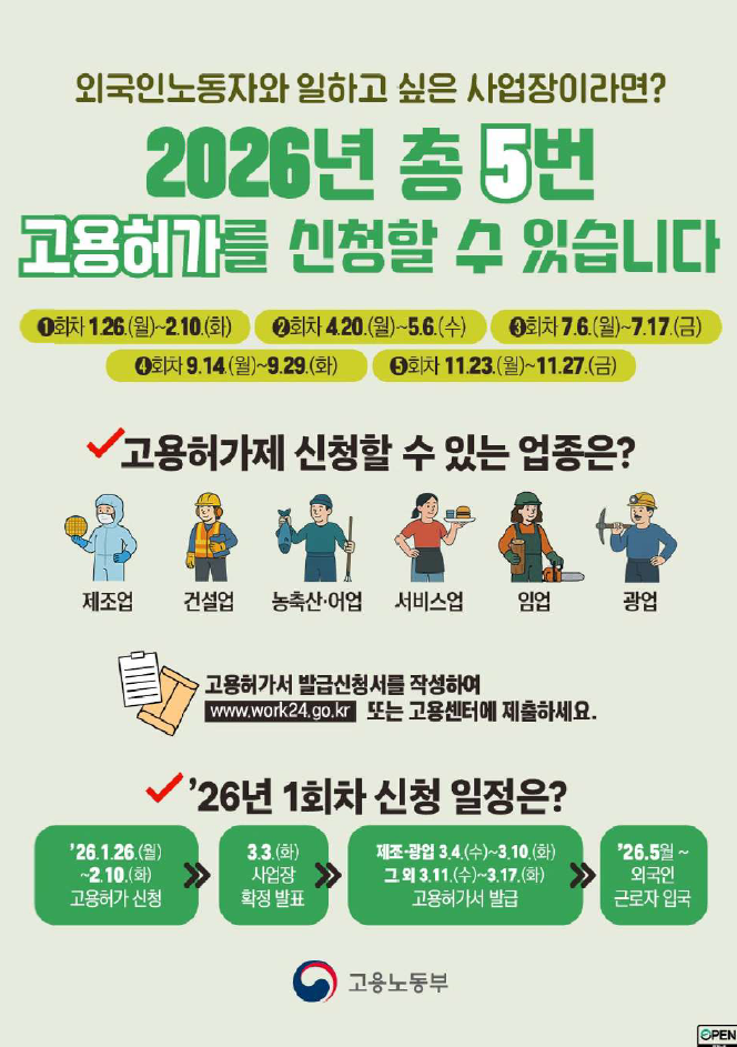 [매일안전신문=김진섭 기자] 고용노동부가 구인난을 겪는 기업이 이주노동자(E-9)를 고용할 수 있도록 ‘26년도에도 5차례 신규 고용허가 신청.접수를 진행할 예정이라고 밝혔다.