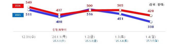연휴 기간 전국 고속도로 교통량은 전년(445만대/일)보다 8.8% 증가한 일평균 484만 대로 예상되며, 최대 교통량은 12월 31일 549만 대가 예상된다.