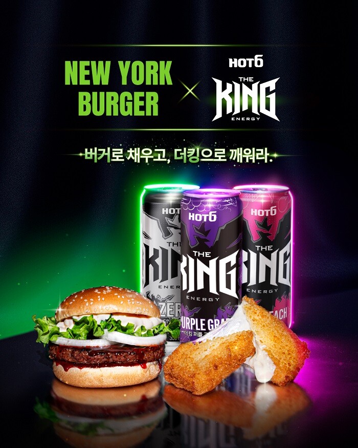 뉴욕버거는 이달 29일부터 롯데칠성음료의 에너지 드링크 핫식스 더 킹과 연계한 ‘더 킹X핫불팩’을 출시한다고 밝혔다.
