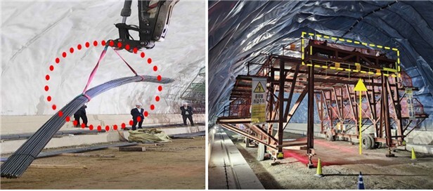 | ▲기존에 터널공사 현장에서 중장비를 이용해 자재를 옮기는 모습(왼쪽)과 롯데건설 터널공사 현장에서 작업대차에 설치한 양중리프트를 이용해 자재를 옮기는 모습(오른쪽) (사진=롯데건설 제공) |