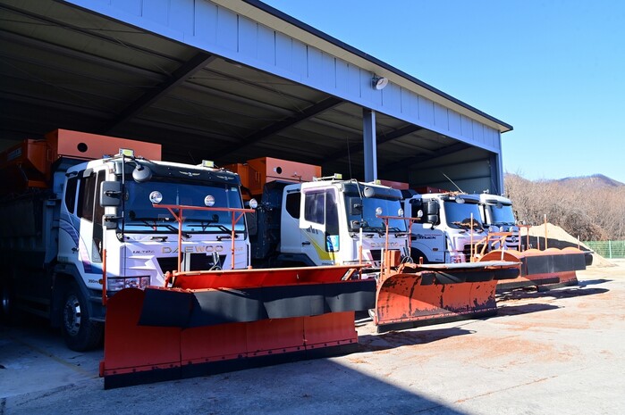 폭설 시 제설작업에 투입될 1t 포터 10대, 2.5t 트럭 1대, 15t 덤프트럭 4대, 트랙터 51대, 제설 삽날, 모래 살포기 등 제설 장비를 정비한다.