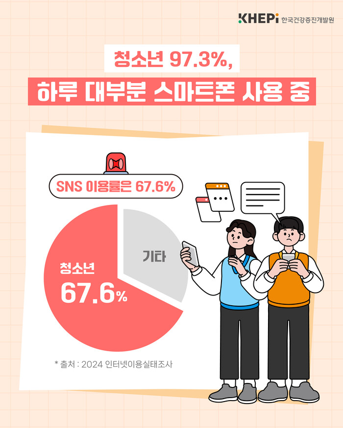 2024년 과학기술정보통신부의 인터넷이용실태조사에 따르면 청소년의 97.3%가 스마트폰을 이용하고 있으며, 사회관계망서비스(SNS) 이용률은 67.6%로 나타났다. 청소년이 스마트폰을 과도하게 사용할 경우 비만, 우울감, 수면장애 등 건강문제를 겪을 가능성이 높아 적극적인 관리가 요구된다.