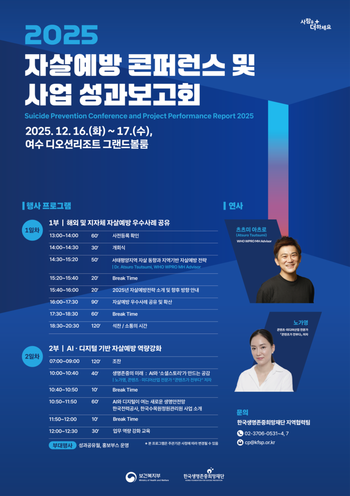 [매일안전신문=김진섭 기자] 보건복지부와 한국생명존중희망재단이 오는 12월 16일~17일 ‘함께 만든 성과, 디지털 혁신으로 여는 자살예방의 미래’를 주제로 「2025년 자살예방 콘퍼런스 및 사업 성과보고회」를 개최한다.
