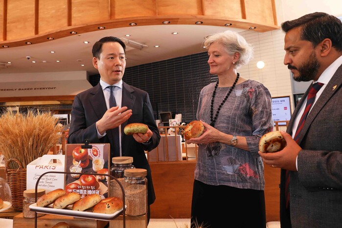 | ▲허진수 SPC 사장(왼쪽)이 타마라 모휘니 주한캐나다대사관 대사대리(가운데), 딘 디아스(Dean Dias) 캐나다 곡물협회 회장에게 고품질 캐나다 밀을 활용한 ‘두번쫄깃 베이글’의 차별화된 식감과 풍미에 대해 소개하고 있다. (사진=파리바게뜨) |