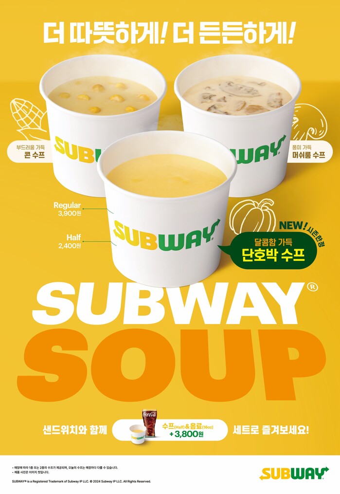 써브웨이 마케팅 담당자는 “겨울철에 고객들이 건강하고 따뜻한 식사를 즐기기에 안성맞춤인 오늘의 수프의 신메뉴인 달콤하고 부드러운 맛을 자랑하는 단호박 수프를 출시하게 되어 매우 기쁘다”며, “앞으로도 써브웨이는 계절에 맞는 다양한 메뉴를 지속적으로 소비자들에게 한층 더 특별하고 새로운 미식 경험을 선사할 것”이라고 말했다.