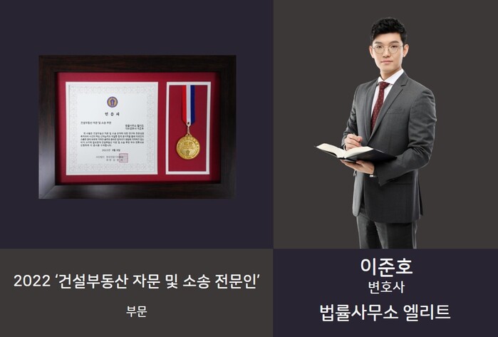 법률사무소 엘리트의 이준호 변호사가 2022년 법률서비스 ‘건설부동산 자문 및 소송 전문인’ 부문에서 전문인 인증패를 수상하는 영예를 안았다.