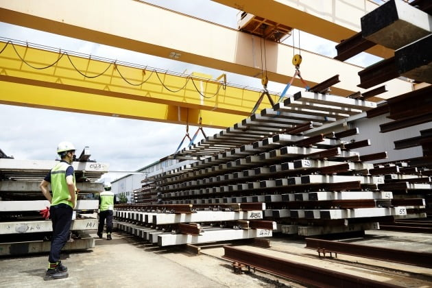 | ▲ 삼표레일웨이 직원들이 생산된 철도분기기를 살펴보고 있다. (사진, 삼표그룹 제공) |
