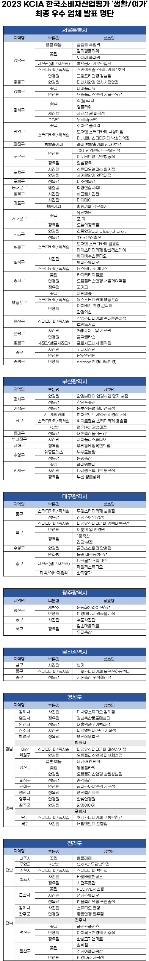 KCA한국소비자평가는 대한소비자협의회가 주최하고 한국소비자평가가 주관하는 <2023 KCIA 한국소비자산업평가 ‘생활/여가’> 서울, 부산, 대구, 광주, 울산, 경상, 전라 지역 평가 결과를 발표했다.