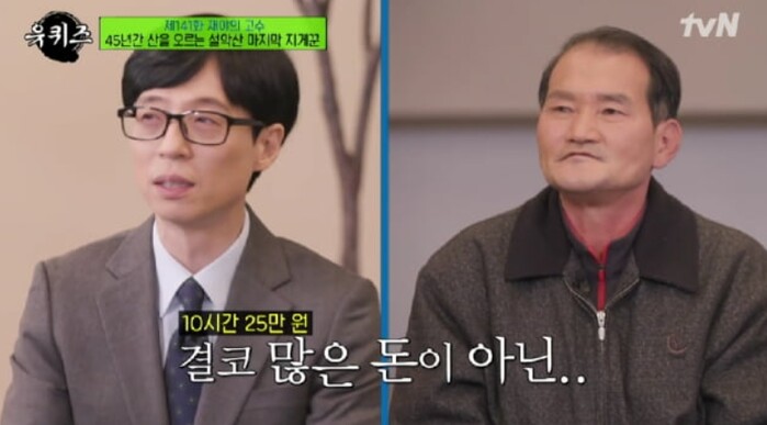 앞서 과거 방송된 tvN '유퀴즈'에서 임기종 씨는 짐을 운반하고 받는 임금에 대해 "비선대까지 가는데 8000원, 비룡폭포까지 6000원, 흔들바위는 2만원, 대청봉은 25만원을 받는다"고 말했다.