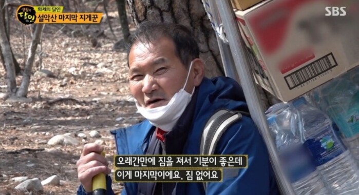 그러면서 임기종 씨는 마지막 짐 배달을 하기에 앞서 "오랜만에 짐을 져서 기분이 좋은데 이제 마지막이다"고 말했다. 또 설악산이 어떤 의미냐라는 질문에 임기종 씨는 "내 부모같이 품어주고 안아주고 푸근하다"고 말했다.