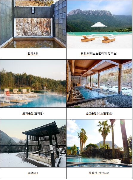 이번에 선정된 온천 6곳은 설악산·속리산·주왕산 등의 아름다운 설경을 경험하거나, 동해 바다 풍경와 제주 화산지형 등 이색적인 풍경과 함께 야외에서 온천(노천탕)을 즐기며 겨울의 정취를 느낄 수 있는 곳으로 선별했다.