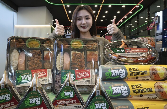 맛제일 시리즈는 '오리불고기&왕교자도시락', '콘치즈떡갈비김밥', '남도떡갈비삼각김밥', '스팸아라비아따파스타' 등 모두 4종이다.