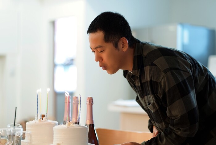 | ▲생일을 맞이해 열정팬들이 마련해준 생일 축하 케익의 촛불을 불어서 끄고있는 가수 김용진(사진=레벨나인컴퍼니) |