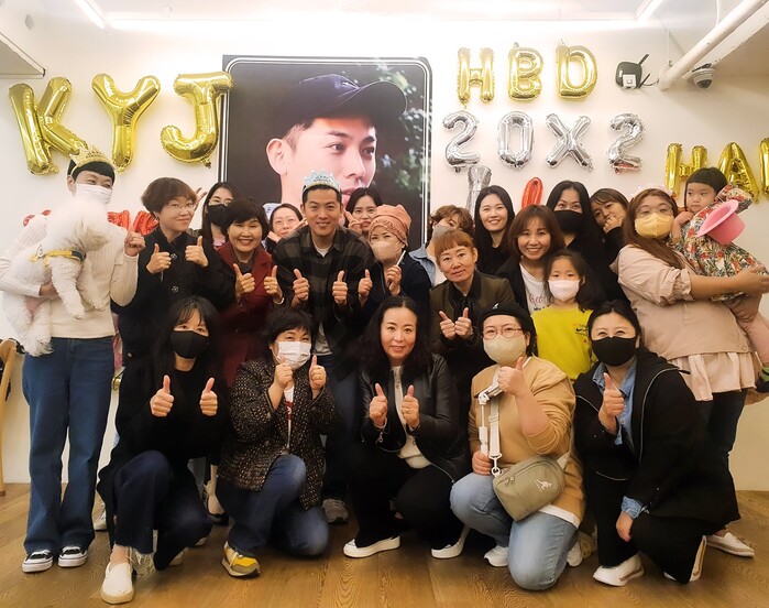 | ▲가수 김용진의 생일맞이 팬미팅에 참석한 열정팬들과 단체사진 촬영 (사진=레벨나인컴퍼니) |