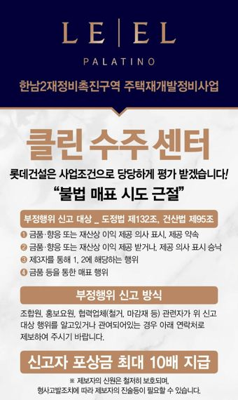 롯데건설 관계자는 “사업 조건으로 당당하게 평가받으며 조합원들에게 신뢰를 줄 수 있는 기업이 되겠다”며 “앞으로도 도시및주거환경정비법, 건설산업기본법 등 영업활동 관련한 다양한 컴플라이언스 교육을 강화하겠다”고 다짐했다.