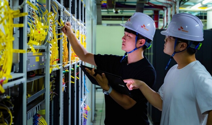 | ▲SK텔레콤 직원들이 백본망에 도입된 800Gbps급 유선망을 정비하고 있다. (사진=SKT) |