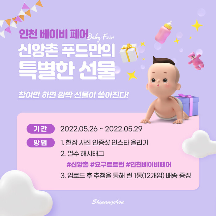 인천 지역 최대 규모로, 세계전람 주최로 진행된 이번 베이비페어에서 천부교 신앙촌은 요구르트 런(Run) 행사 부스를 마련해 많은 고객의 눈길을 끌었다. 당일 현장에서 요구르트 런 1통(12병 포함) 구매 시 빨대캡을 추가로 증정하고, 행사 현장에서 정기 배송을 신청한 고객들에게는 가정으로 무료 배송해주는 이벤트를 선보였다. 또한 현장에서 아이와 함께하거나 요구르트 런을 먹는 모습 등의 인증사진을 인스타그램에 올리면 추첨을 통해 요구르트 런 1통(12개입)을 배송 증정해주는 이벤트를 진행해 큰 호평을 받았다.