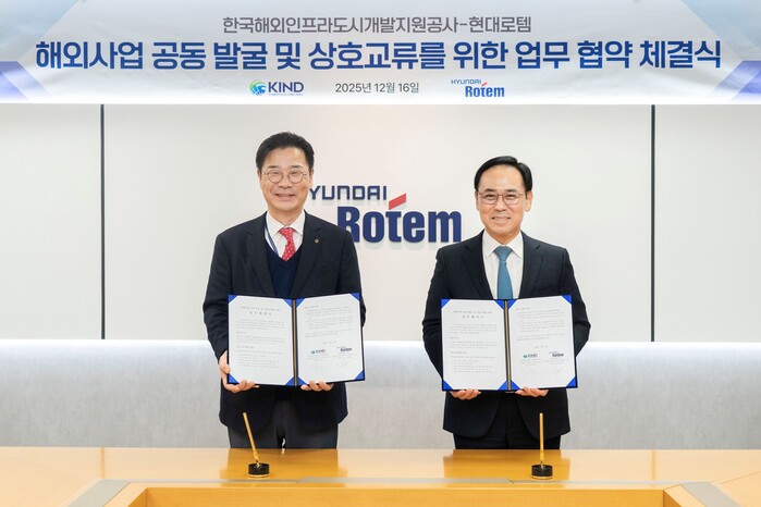 현대로템은 지난 16일 경기도 의왕시에 위치한 본사 사옥에서 KIND와 해외 철도사업 공동 발굴 및 상호 교류 강화를 위한 업무협약(MOU)을 체결했다고 17일 밝혔다.