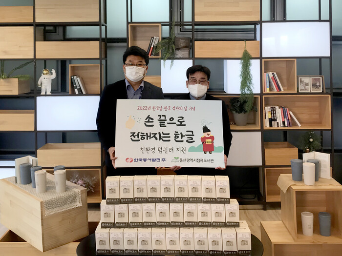 한국동서발전은 2022년 제 96주년 한글날(10월9일)과 한글 점자의 날(11월4일)을 기념해 ‘손 끝으로 전해지는 한글’을 위한 친환경 텀블러 250개를 울산광역시점자도서관에 전달했다고 6일 밝혔다.