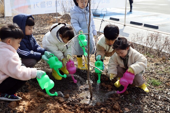 | ▲ LX공간정보연구원이 '꿈나무와 함께하는 녹색 미래 만들기' 식목행사를 진행했다. 사진은 직접 심은 사과나무에 물을 주고 있는 아이들의 모습(LX한국국토정보공사 공간정보연구원 제공) |