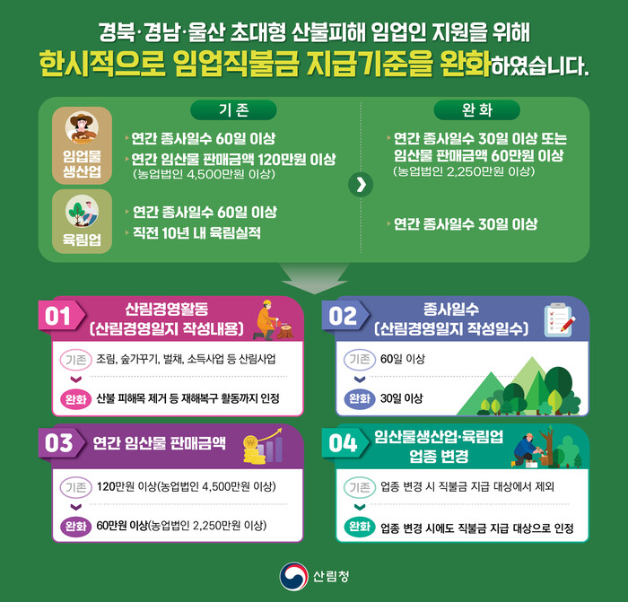 이상익 산림청 산림산업정책국장은 "산불로 생활 터전을 잃은 임업인들이 한시적 제도 완화를 통해 안정적으로 산림경영에 복귀할 수 있도록 적극적으로 지원할 계획"이라고 말했다.