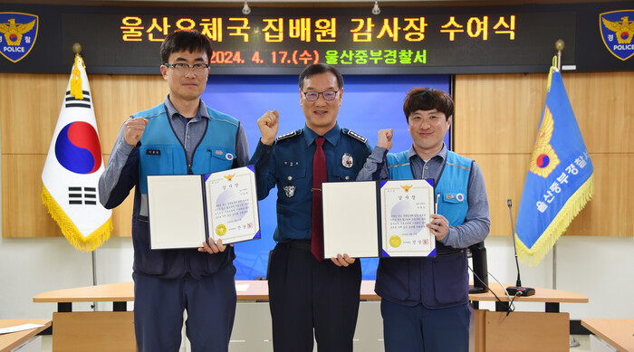 울산 중부경찰서는 의식을 잃고 쓰러진 노인을 발견해 신속하게 구호 조치한 집배원 2명에게 감사장을 수여했다고 17일 밝혔다.