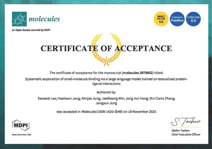 [매일안전신문=김진섭 기자] 신테카바이오가 거대언어모델(LLM) 기반 단백질–저분자 결합 분석 모델 '3bm GPT' 관련 연구가 스위스에 위치한 국제 SCI 학술지 'MDPI Molecules' 30주년 특별판에 게재됐다.