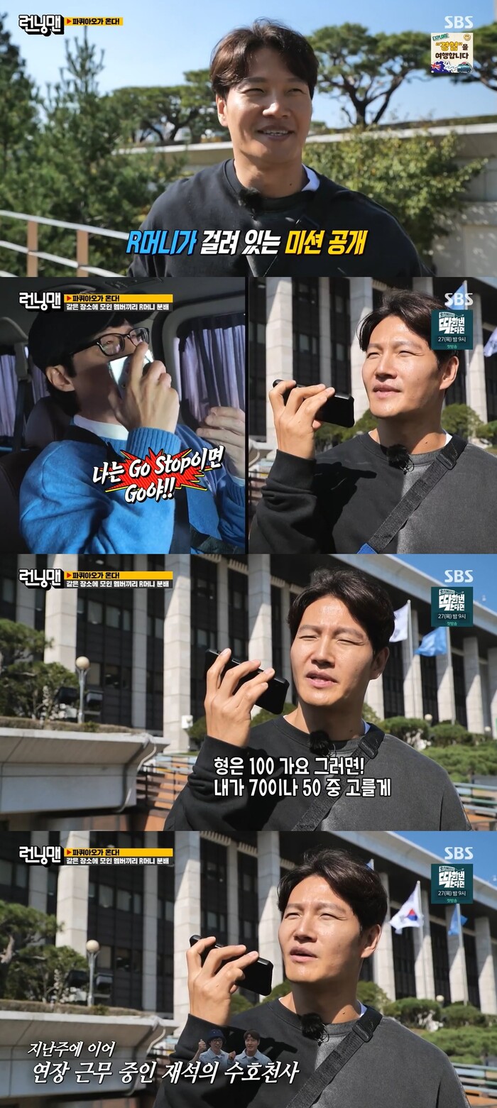 이날 방송에서 제작진은 각자 따로 모인 멤버들에게 R머니가 걸린 레이스라고 설명했다. 이어 여의도에 지정된 3곳의 장소에 50, 70, 100만 원이 걸려있다고 밝히며 같은 장소에 모인 멤버끼리 금액을 나누어 갖게 된다고 말했다.