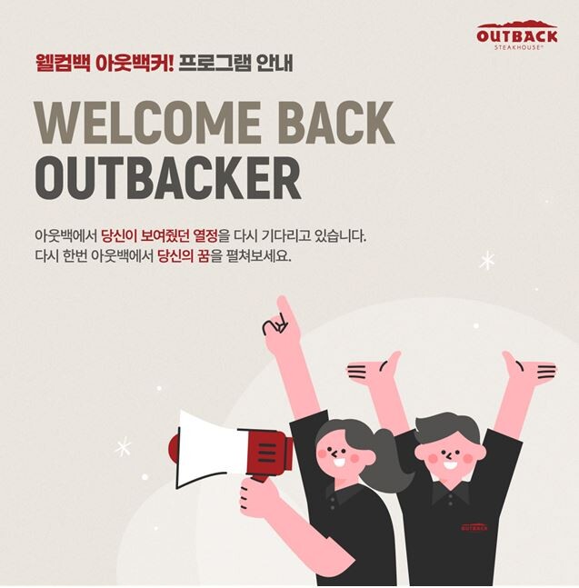 아웃백은 퇴직한 아웃백커에게 재입사 기회를 제공하는 ‘웰컴백 아웃백커’ 프로그램을 진행한다고 22일 밝혔다.