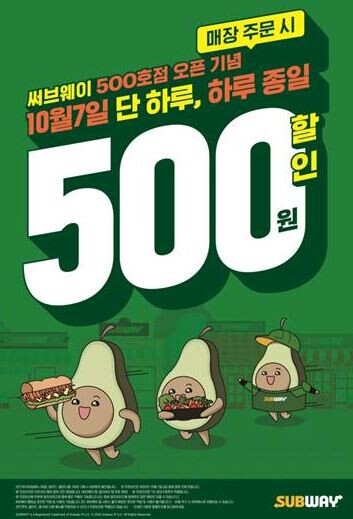 써브웨이 마케팅 담당자는 “500호점 돌파라는 뜻깊은 이정표를 지날 수 있도록 함께해주신 고객님들께 보내주신 사랑에 감사의 마음을 전달하고자 이번 할인 행사를 준비했다”라며, “앞으로도 써브웨이는 맛, 신선함, 건강함을 모두 갖춘 다채로운 샌드위치로 고객의 개성과 취향을 만족시킬 것”이라고 말했다.