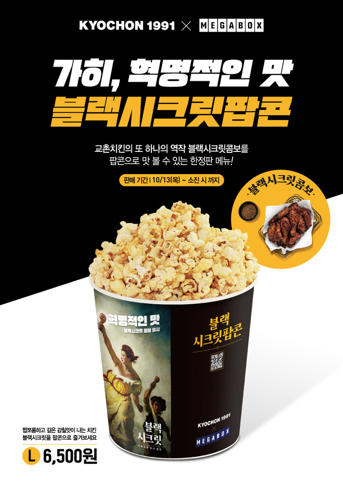 ‘블랙시크릿팝콘’은 약 한달간(소진 시까지) 판매하는 한정판 메뉴다. 교촌블랙시크릿팝콘용 패키지에 담아 제공되며 메가박스 코엑스점과 대구신세계점 등 전국 51개 지점에서 제공된다. 사이즈는 라지, 레귤러로 구성됐다.