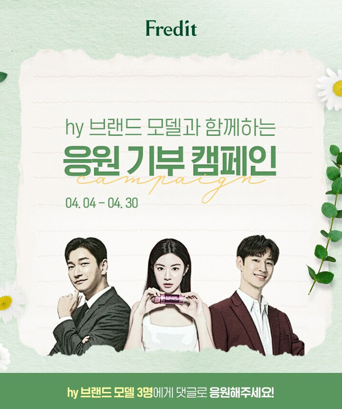 참여를 희망하는 고객은 ▲헬리코박터 프로젝트 윌 모델 조승우 ▲발휘홍삼 모델 이제훈 ▲MPRO 4 모델 고윤정 가운데 응원한 모델의 페이지에서 댓글로 모델을 응원하면 된다. 댓글이 1000건을 넘어서면 기부금 100만원 상당의 프레딧 제품을 모델의 이름을 기부하게 된다.